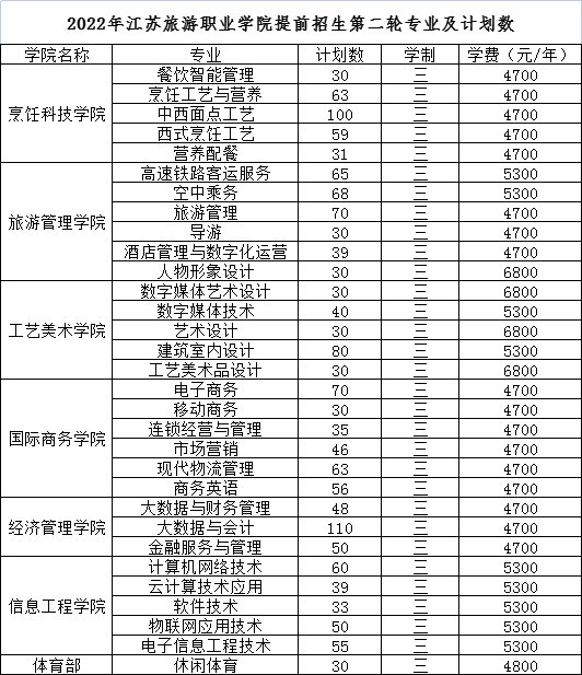 江苏旅游职业学院2022年提前招生第二轮专业及计划数